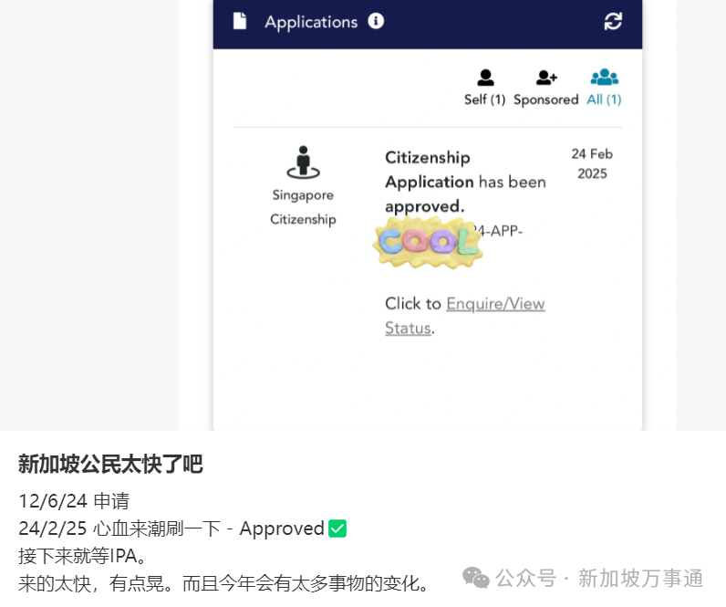 还有网友表示,自己的新加坡公民身份批的太快了!2024年6月中旬提交的申请,今年2月底就通过了。不敢置信!