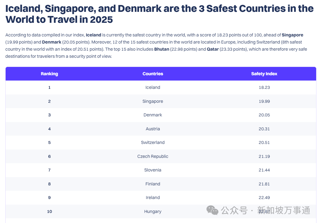 加拿大保险网站公布的2025年旅行安全指数城市名单,最安全的旅游城市及国家前三分别为:冰岛、新加坡、丹麦。