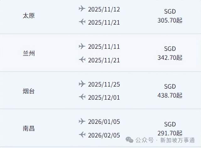 从中国12城市直飞往返新加坡的航班,机票价格低至799元(146.5新元)!