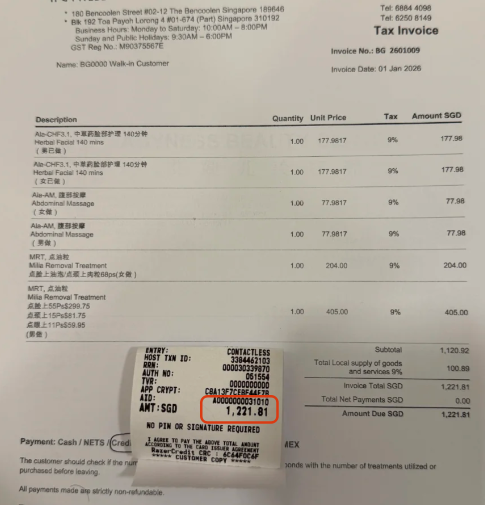 最令人气愤的是油粒清除环节,工作人员起初承诺3新币一颗,仅做6颗,可做完后却告知实际做了68颗,又额外收取225新币(含消费税)。