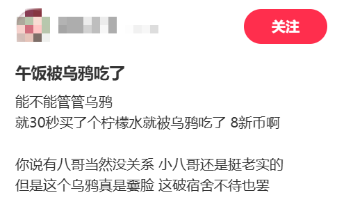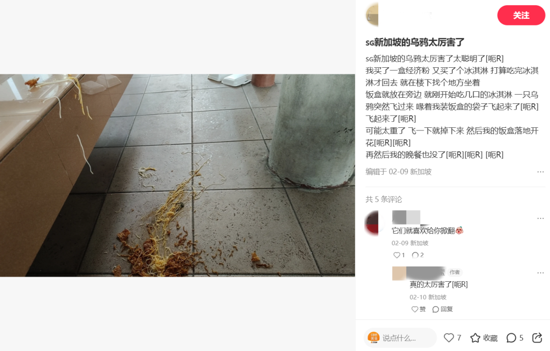有不少网友表示新加坡乌鸦就喜欢偷吃的,自己花钱买来的吃食还没吃上一口就被乌鸦弄毁了。