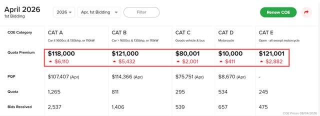 这次应对大众市场的中小型车组(A组)成价上涨6110新元,达到11万8000新元,已经接近历史高位。