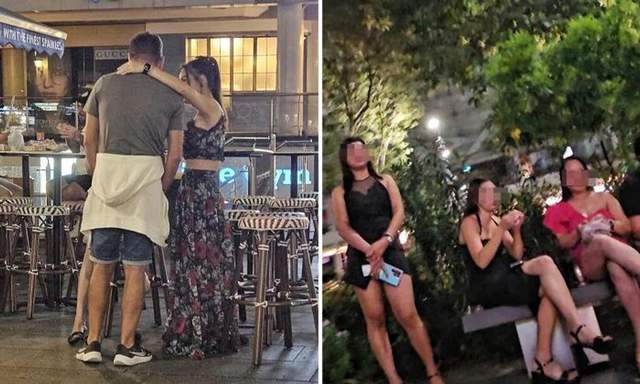 她们大多穿着清凉,吊带衫几乎是标配。有的独自坐在石凳上,有的倚着商场台阶,目光不断扫视,一有机会就主动上前与路过男性搭讪。