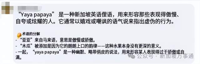 评论区有网友给大家科普了“yaya papaya”是什么意思,是新加坡式英语,用来形容表现的傲慢、自夸或炫耀的人。