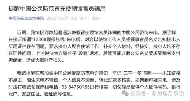 还有人假冒使领馆官员诈骗。为此,大使馆发出紧急提醒:在新加坡中国公民防范冒充使领馆官员骗局。