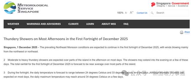 根据气象署发布的消息,12月前两周,新加坡将持续受到东北季风影响,多数下午都会出现中到大雷阵雨,有时雨势将延续到傍晚。