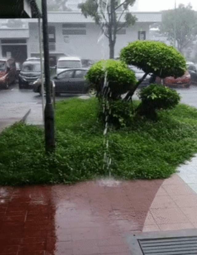 大风+雷阵雨,简直是“绝杀”,组屋楼下的草地,都成了“水池”。