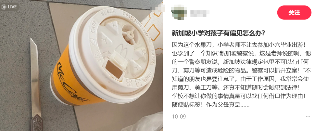 有陪读妈妈吐槽:“孩子包里装了水果刀,老师警告小六毕业出游活动别参加了!”