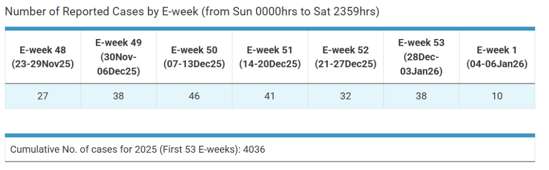 新加坡上周(2025年12月28日-2026年1月3日)新增38起骨痛热病例,比前一周多了6起。