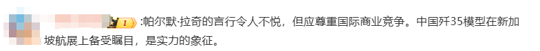 有网友表示:帕尔默·拉奇的言行虽然令人不悦,大家应该尊重国际商业竞争。中国歼35模型在新加坡航展上备受瞩目,也是实力的象征。